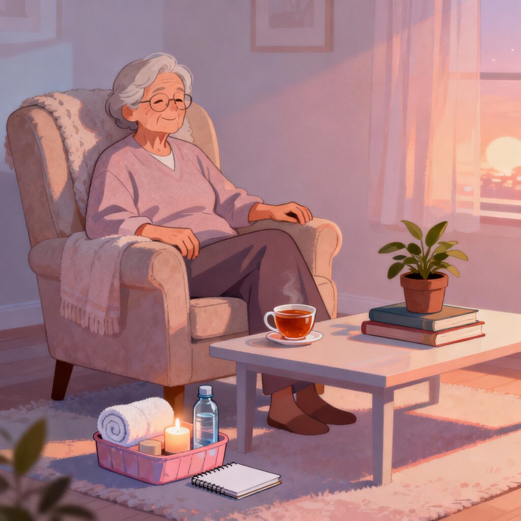 - Elementos para bienestar emocional: mantas de confort, velas aromáticas, música relajante y materiales para hobbies creativos.